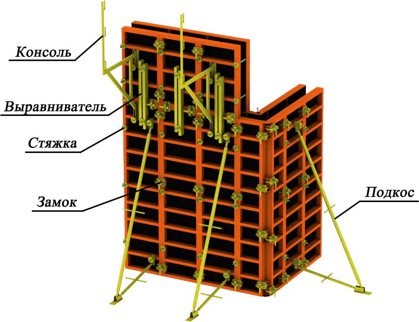 Основные элементы опалубки – стеновые щиты. Прочность и надежность опалубка стен приобретает за счет стального каркаса щитов, благодаря которому конструкция выдерживает давление бетона до 80 кПа, не деформируется и не изнашивается.